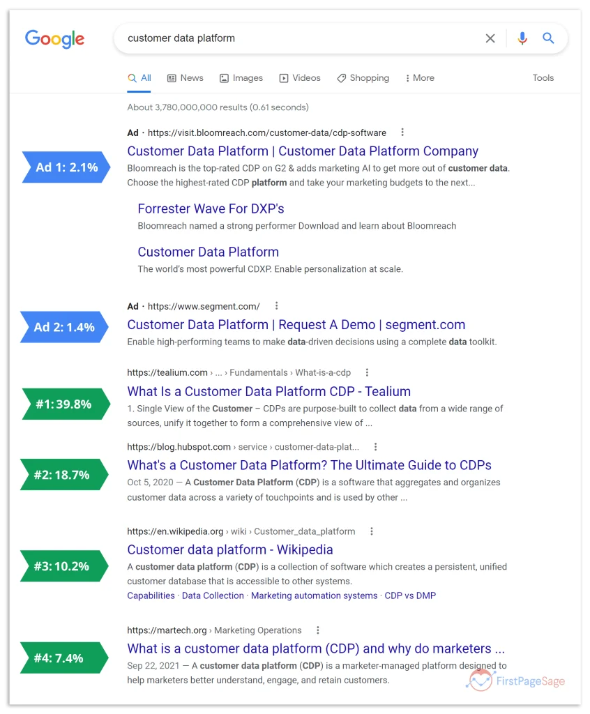 Cuando hablamos de marketing de buscadores, las ofertas como la comida, entran por la vista. De nada sirve poseer el mejor producto o escribir el texto publicitario más ingenioso si nadie lo ve. La mayoría de nosotros, cuando realizamos una búsqueda en Google, nos fijamos principalmente en los primeros resultados. Debido a esto, los resultados en la parte superior de la página son, además de los más vistos, también los más visitados. Según los estudio de FirstPageSage y Backlinko, los primeros resultados orgánicos (es decir, no pagados) acumulan algo más de la mitad de todos los clics. En el caso de la publicidad ocurre algo similar: una posición más alta de nuestro anuncio en los resultados de búsqueda incrementa substancialmente las posibilidades de que los usuarios visiten nuestra página web.